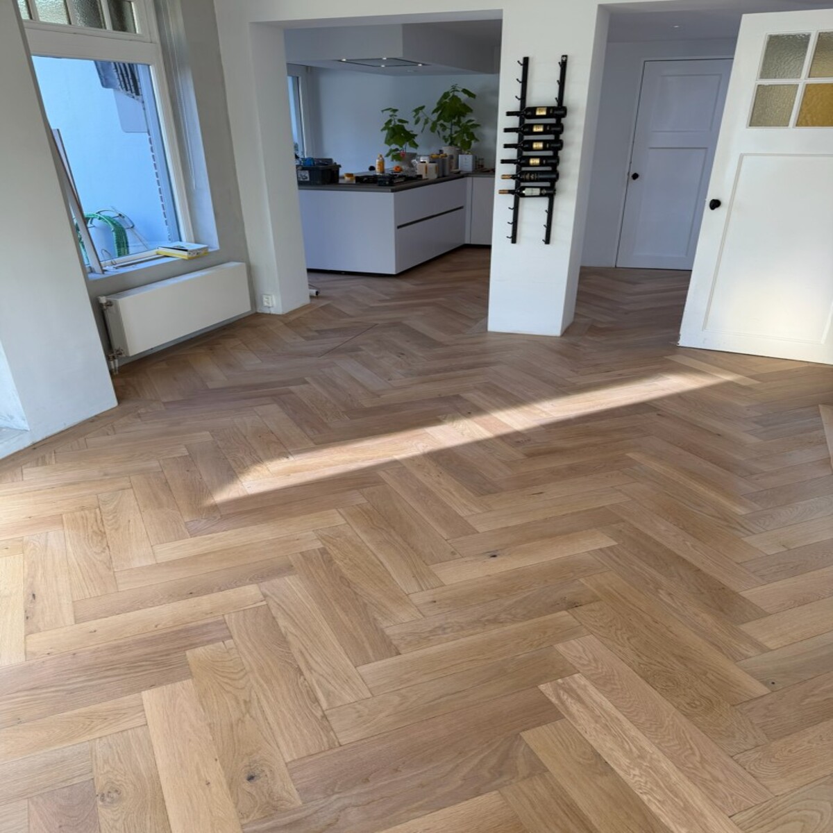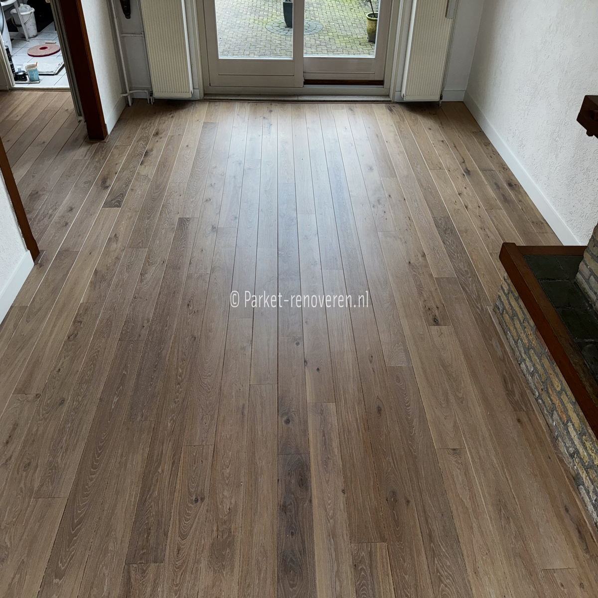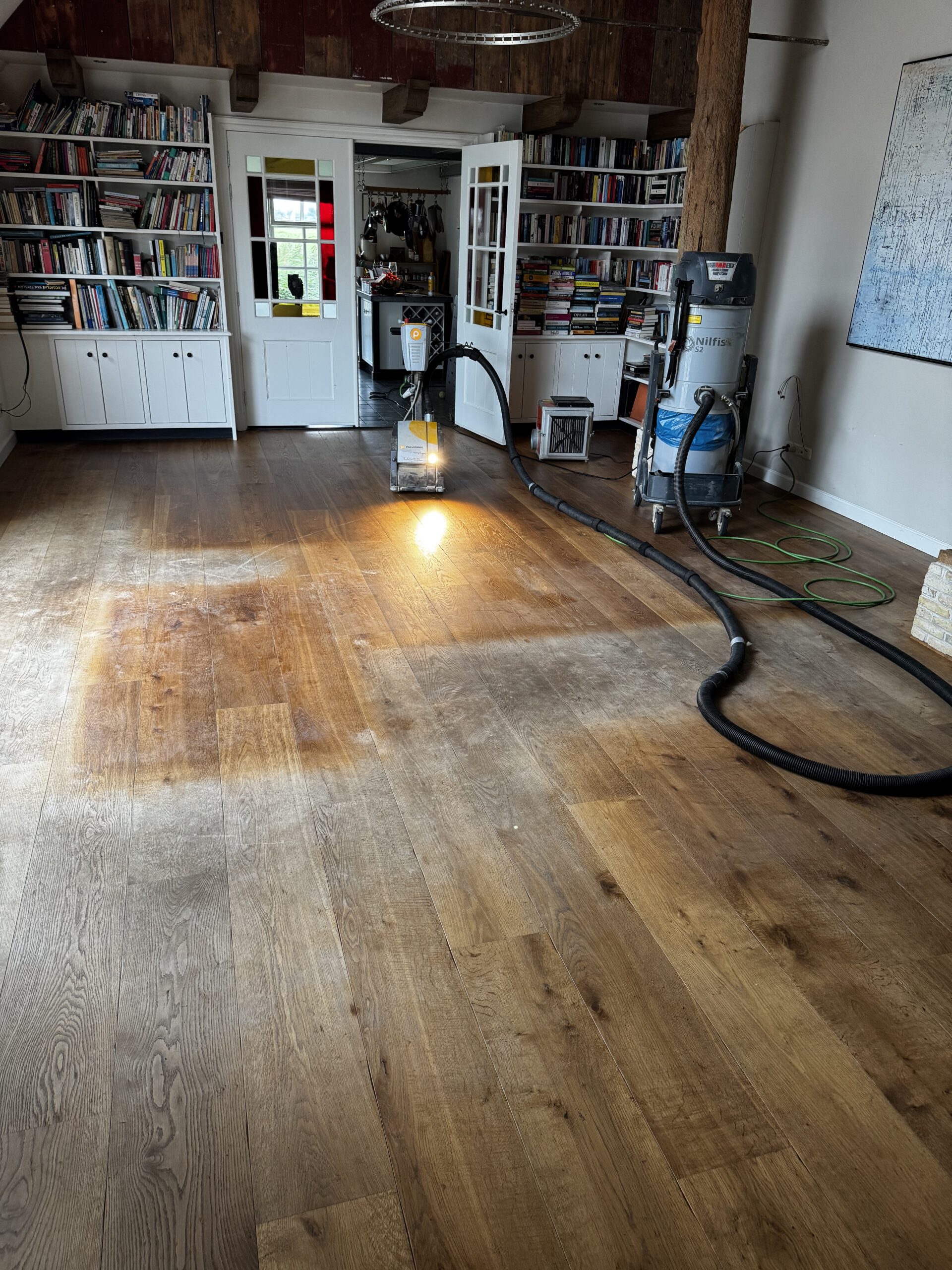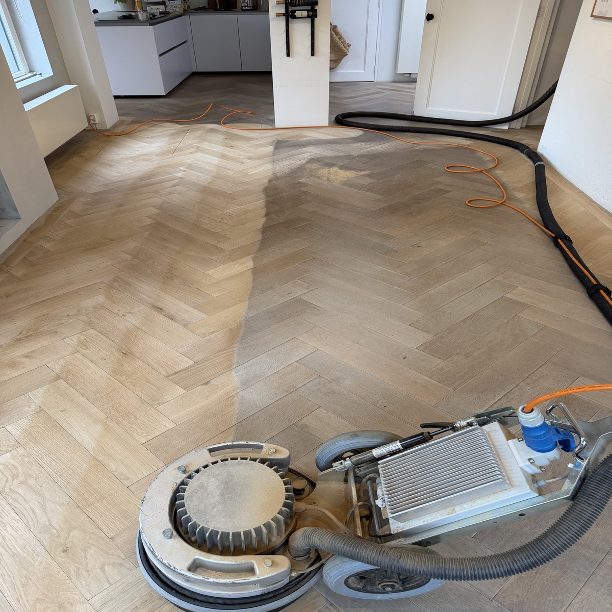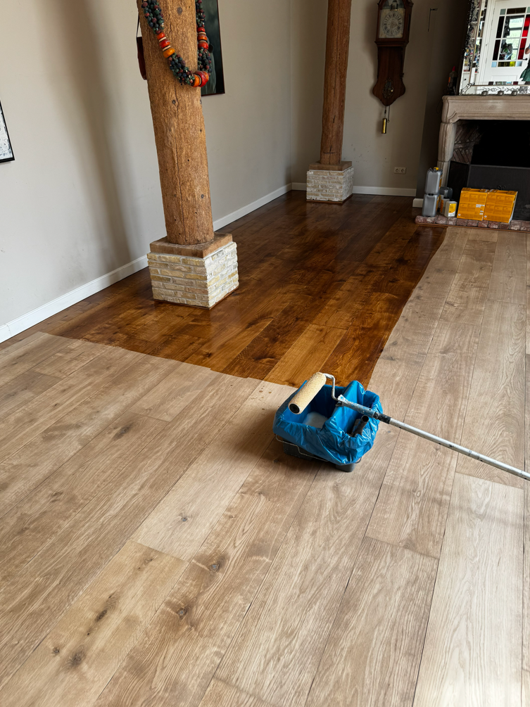 Bij schuren en oliën brengen we de natuurlijke schoonheid van het hout opnieuw tot leven. Na het schuren behandelen we de vloer met een hoogwaardige olie die diep in het hout dringt en het beschermt van binnenuit. Dit zorgt voor een warme, matte uitstraling en eenvoudig onderhoud.